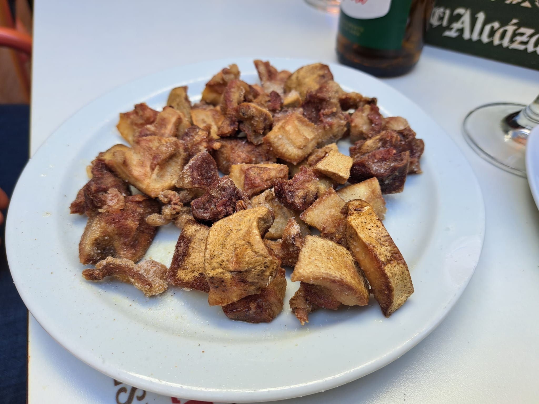 Lo mejor, sin duda, sus tapas y raciones: morros, queso curado, rabas, ensaladada de cangrejo,…y una infinidad de tapas, la gran mayoría, de acompañamiento, totalmente gratis, con vuestra Alcázar bien fría…o con la consumición que prefiráis.