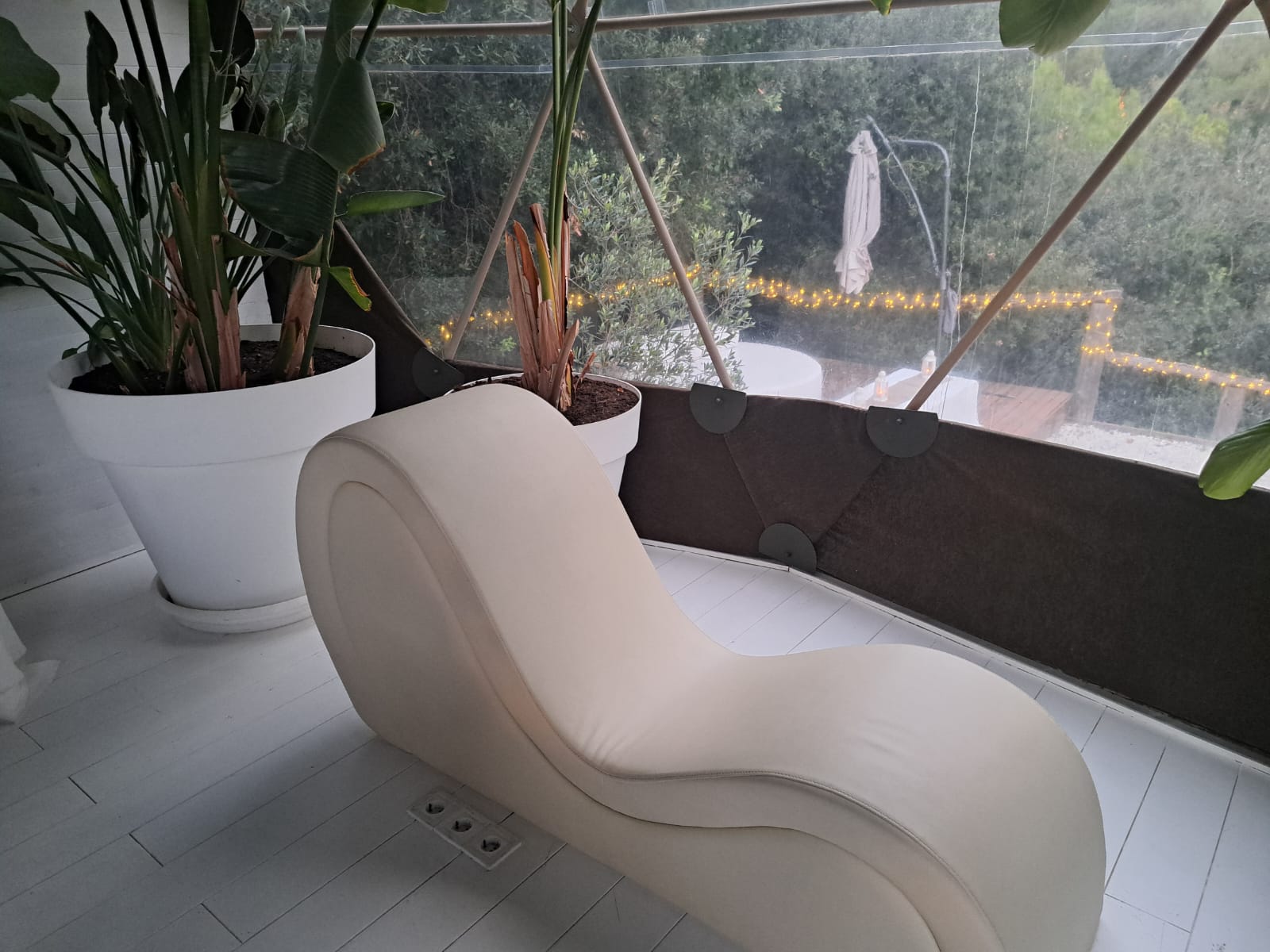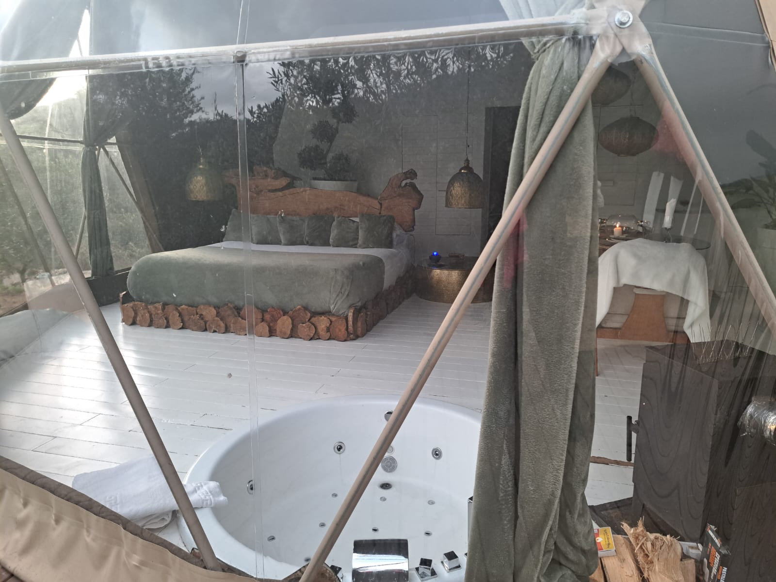 El más exclusivo y elegante de todos los domos y el que nosotras elegimos. Considerado el más exclusivo, el Domo Olivo combina naturaleza y elegancia moderna. Con un diseño interior luminoso en tonos blancos, sofá de masaje y un espacio exterior amplio para relajarse, es el domo perfecto para quienes buscan una experiencia premium.