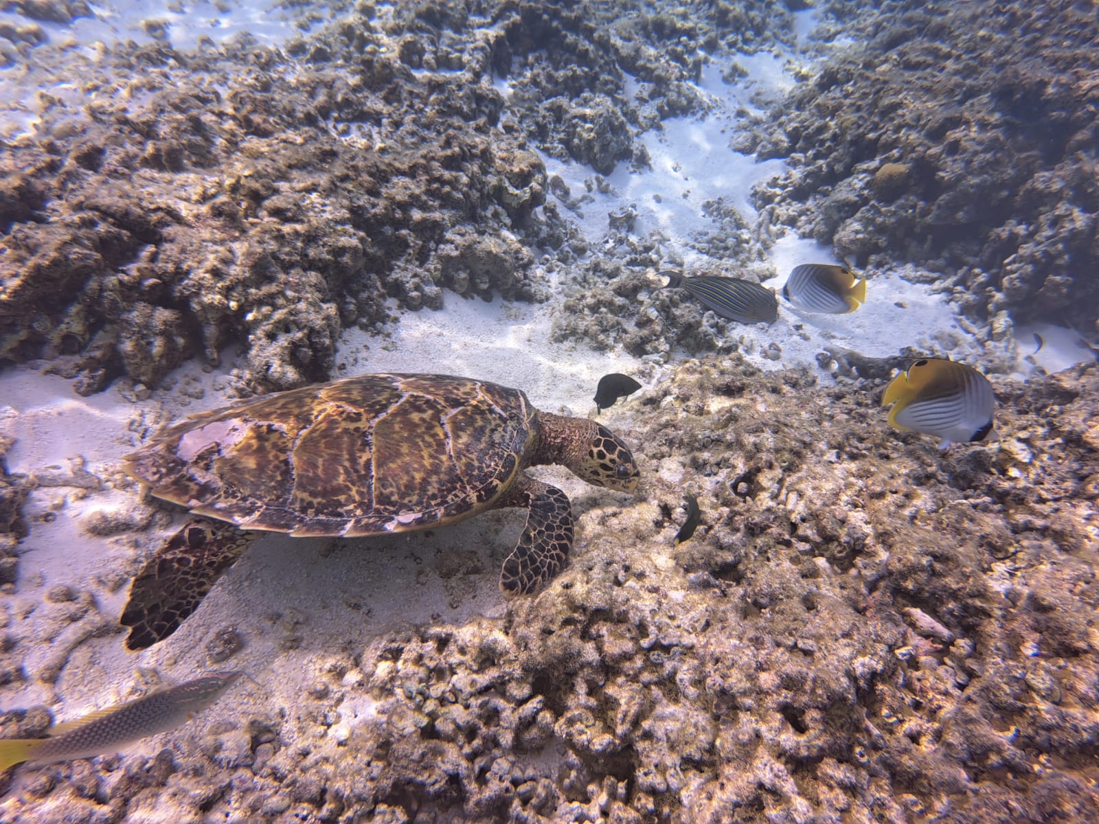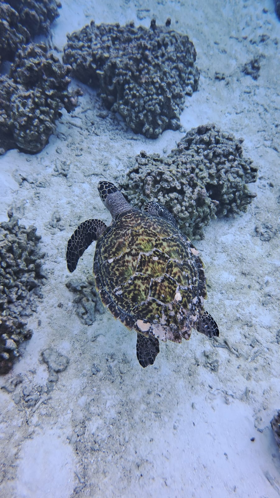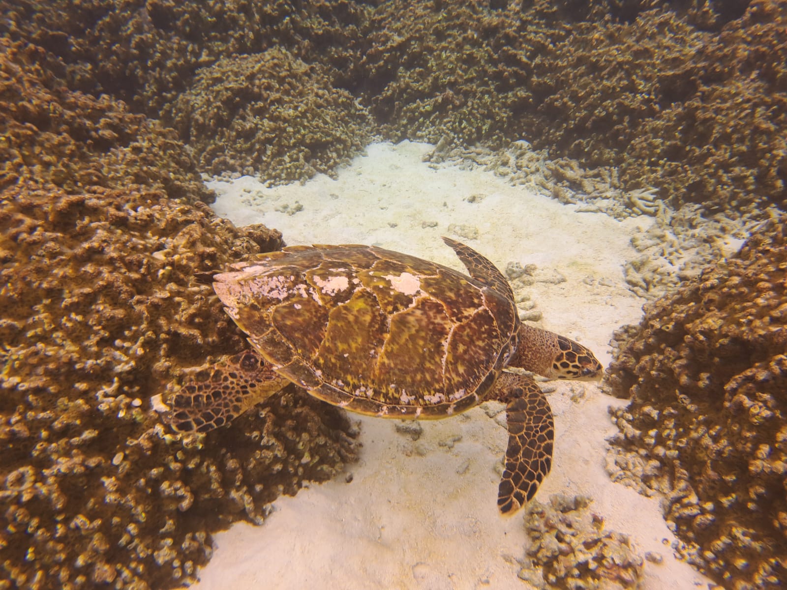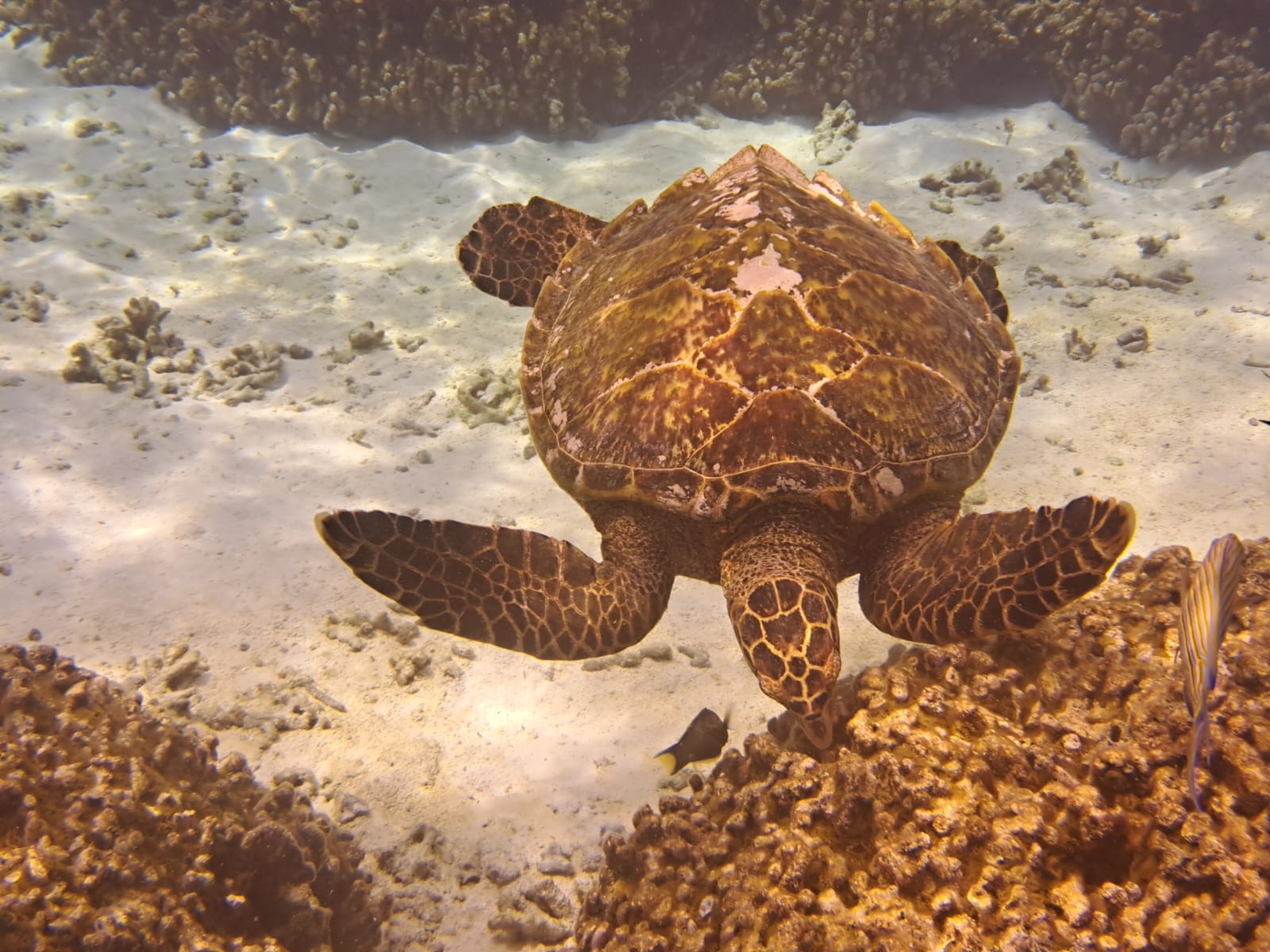 Pero la verdadera magia de Thoddoo está bajo el agua. Su bikini beach es un punto excelente para ver tortugas verdes nadando entre corales a poca profundidad. Basta ponerse la máscara y avanzar unos metros para encontrarse en un escenario digno de un documental.