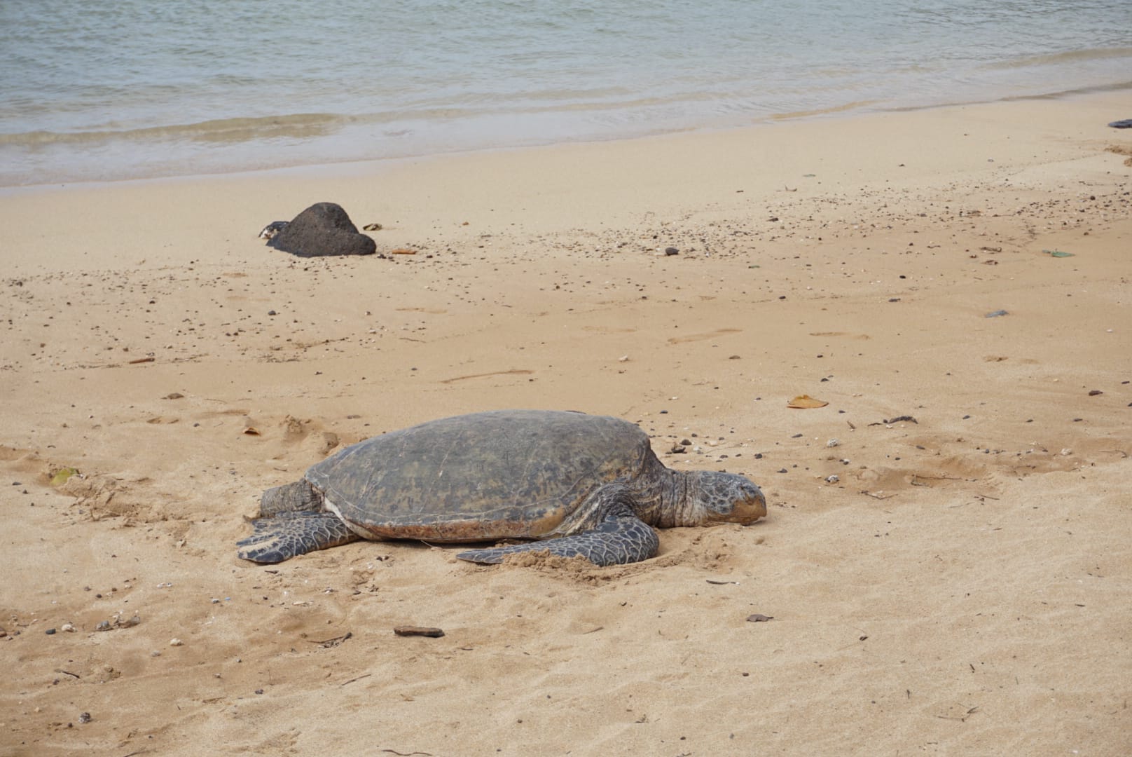 Ver tortugas marinas hawaianas descansando en la arena, especialmente al atardecer.